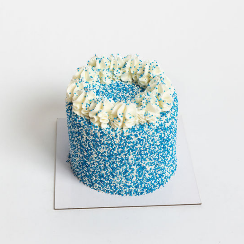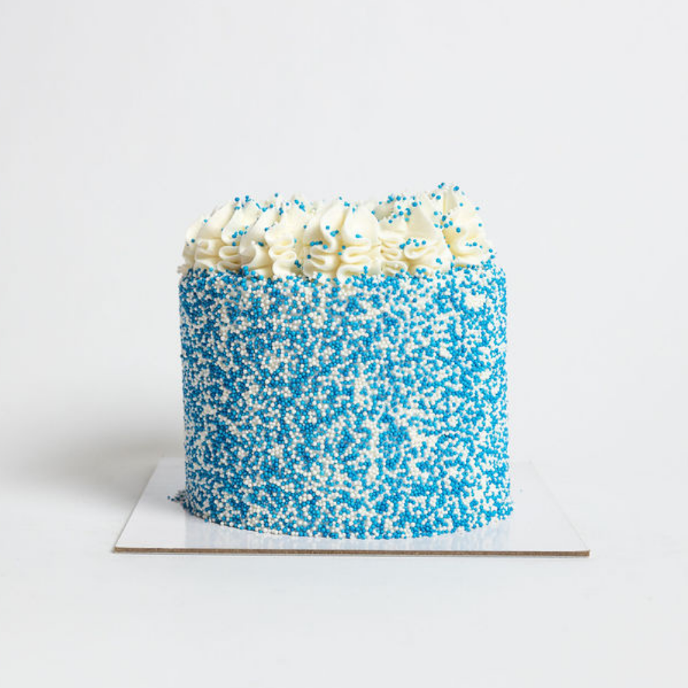 • Coated in white buttercream & covered in blue and white 100s & 1000s