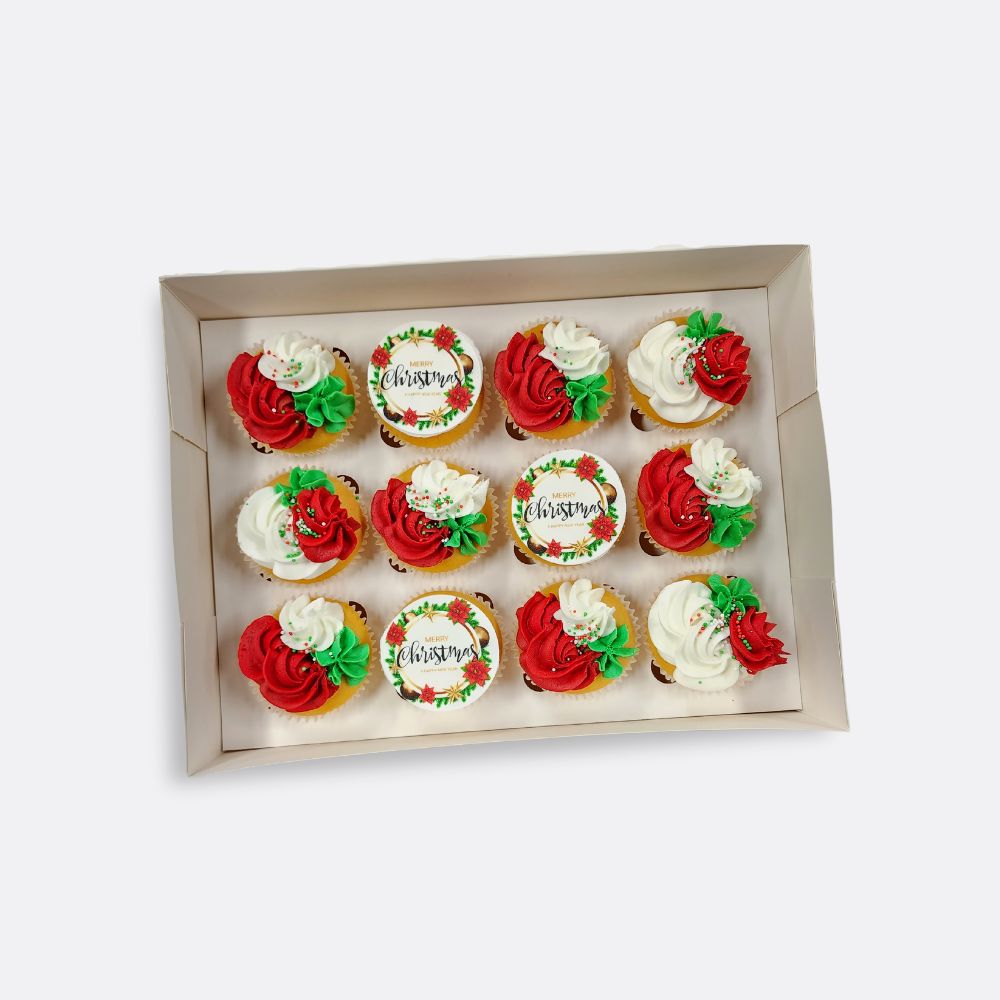 • 12 Vanilla Cupcakes with xmas themed colous vanilla buttercream icing
