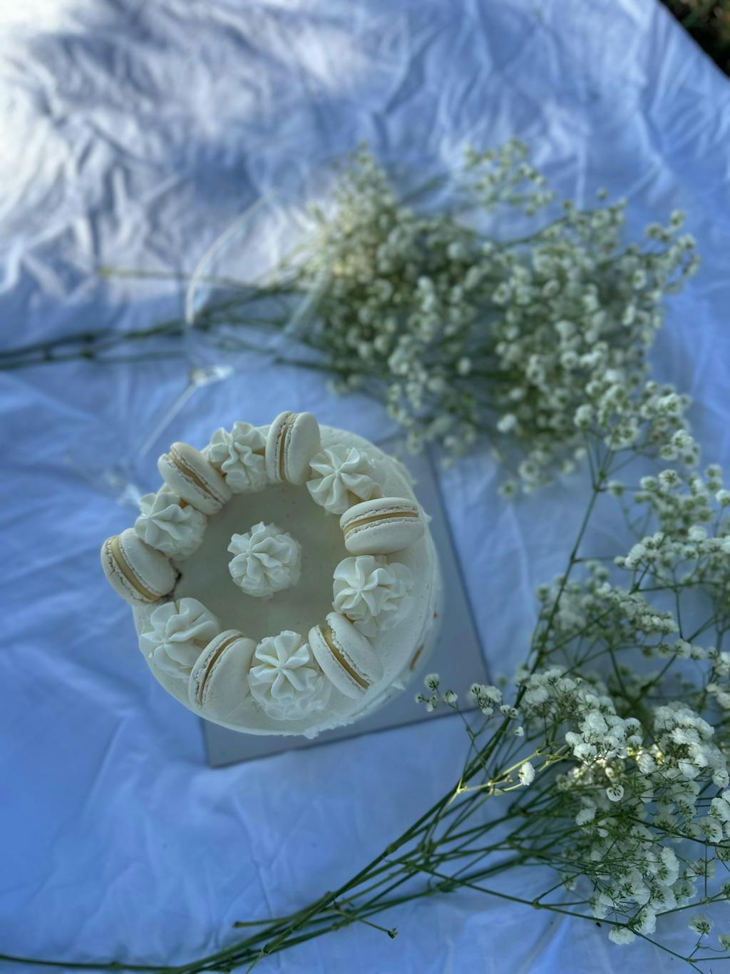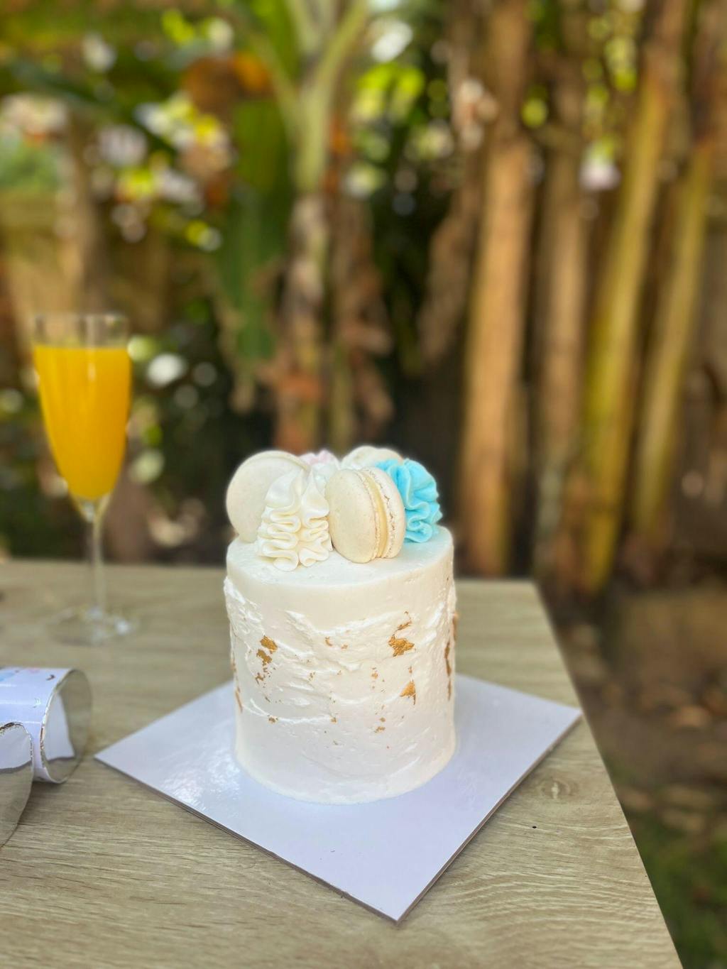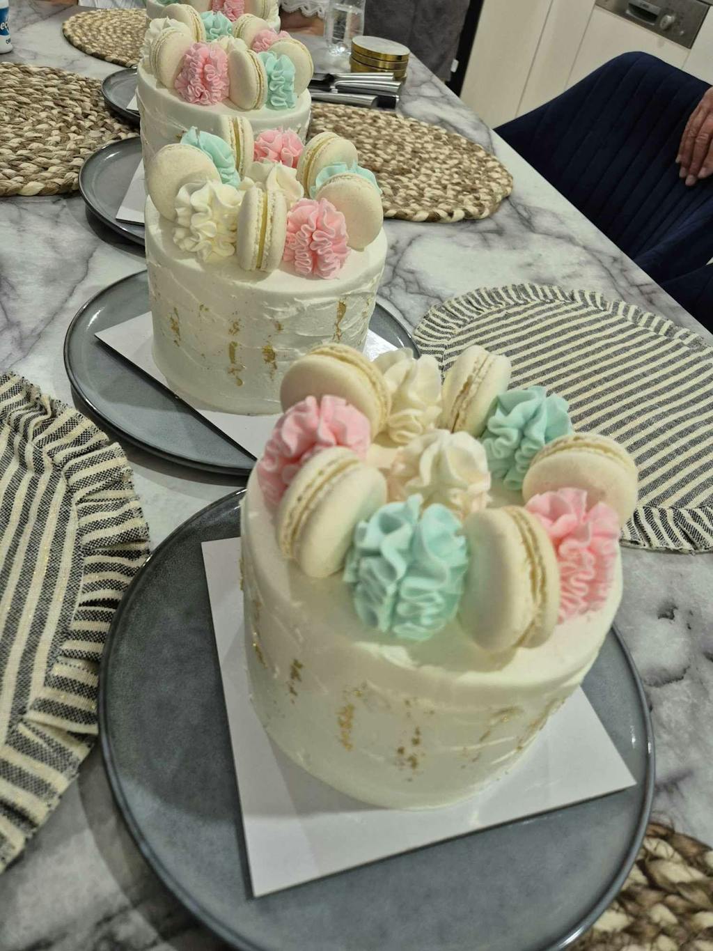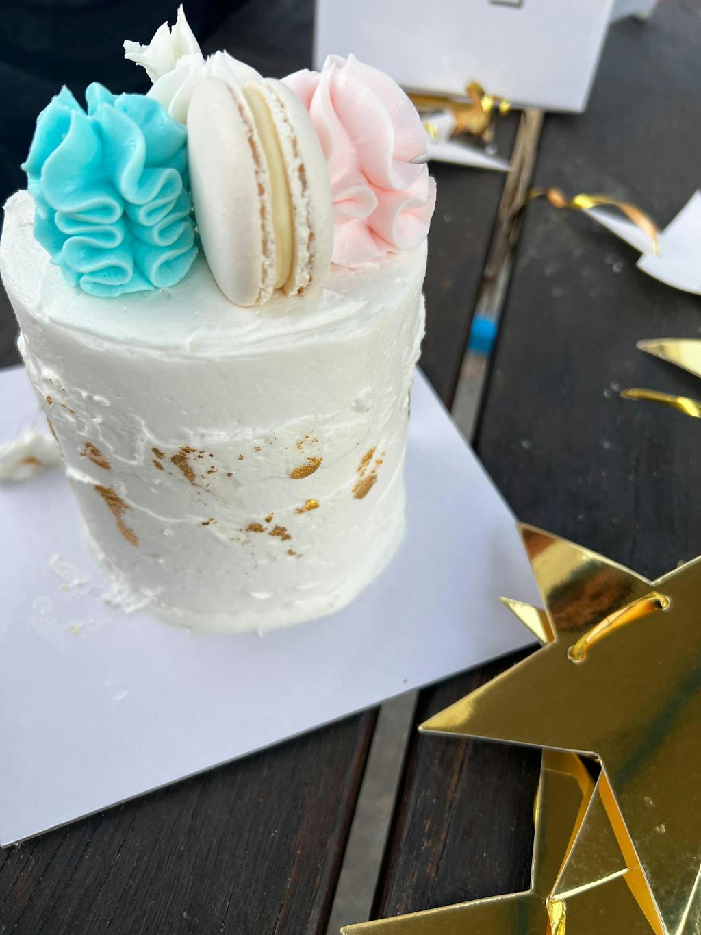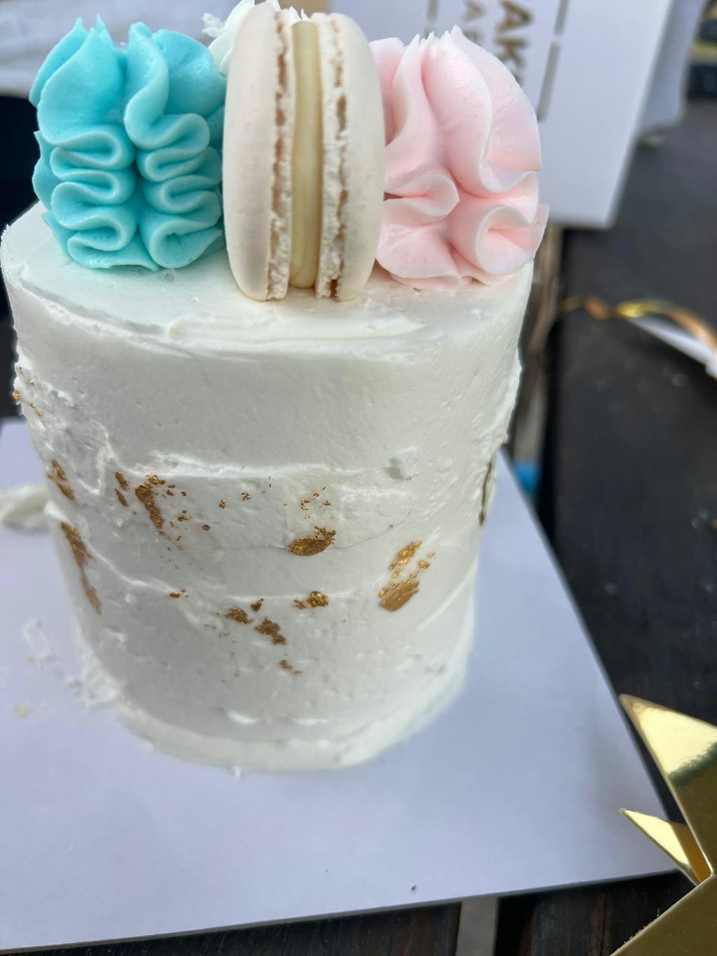 • Delicious Macarons and decorative pink and blue piping (3 Macarons on a 4″ cake, 4 Macarons on a 6″ cake and 6 Macarons on a 7″ cake)