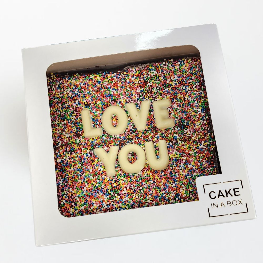 Our delicious chocolate brownie slab, topped with sprinkles and white chocolate letters. Is the perfect Gift idea for a friend or family member.