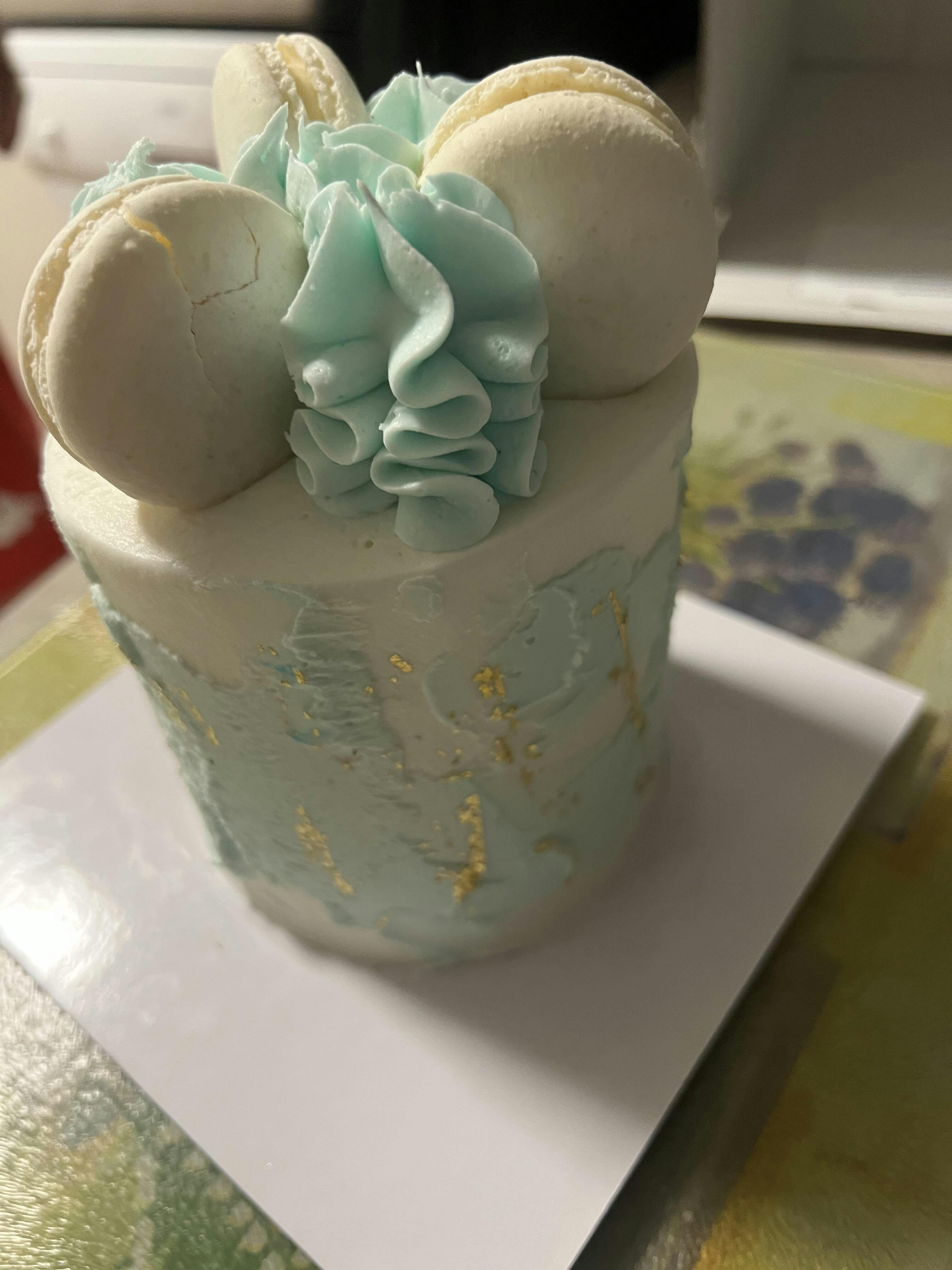 • Delicious Macarons and decorative piping (3 Macarons on a 4″ cake, 4 Macarons on a 6″ cake and 6 Macarons on a 7″ cake)