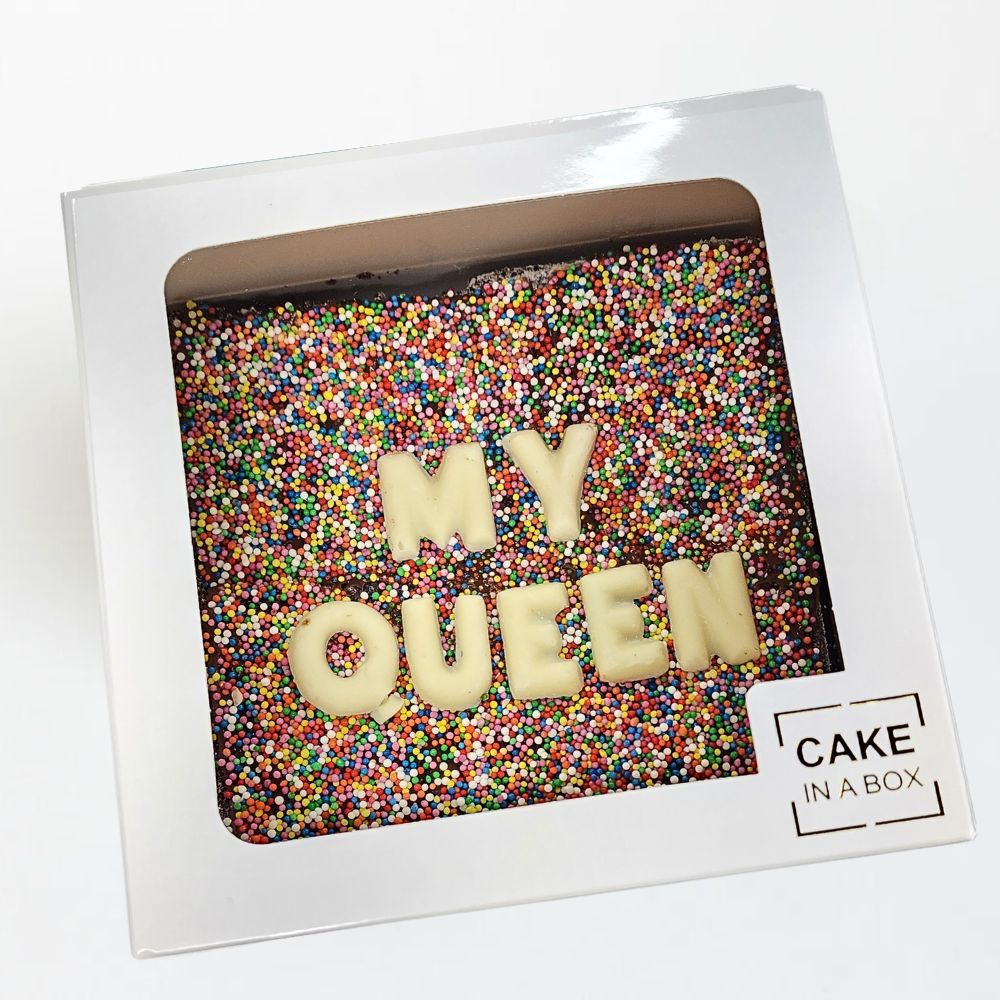 Our delicious chocolate brownie slab, topped with sprinkles and white chocolate letters. Is the perfect Gift idea for a friend or family member.